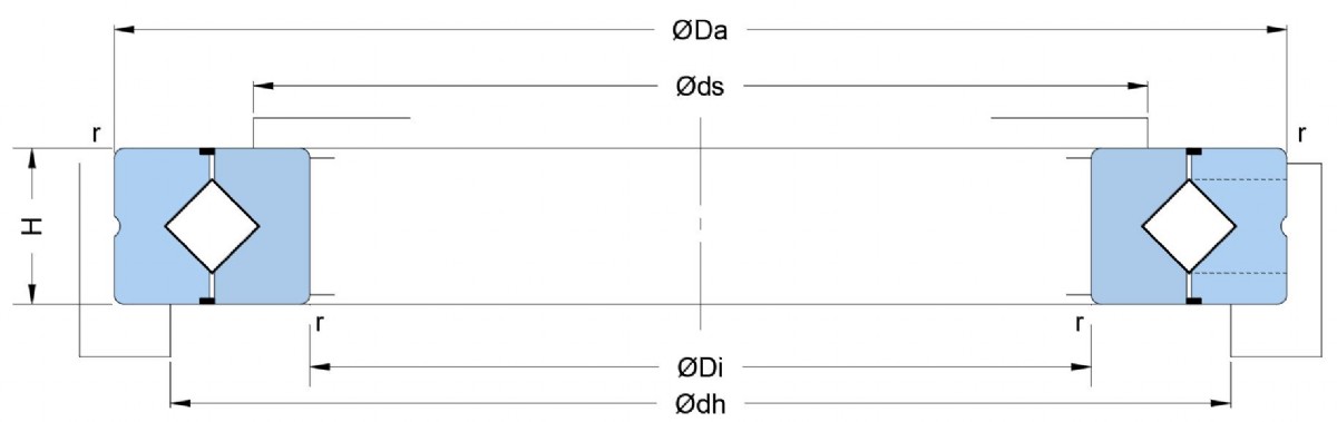 CRBH series crossed cylindrical roller bearings (integral inner and outer rings, ultra-thin) CRBH series crossed cylindrical roller bearings, which is an ultra-thin RU series bearing, due to the ultra-thin design and no mounting holes for the outer ring and inner ring , the installation needs to be fixed by the flange and the support seat. In addition, since the outer ring and inner ring are integral structures, installation has no effect on performance, so stable rotation accuracy and torque can be obtained. It is suitable for occasions where the outer ring and inner ring rotate but require miniaturization.